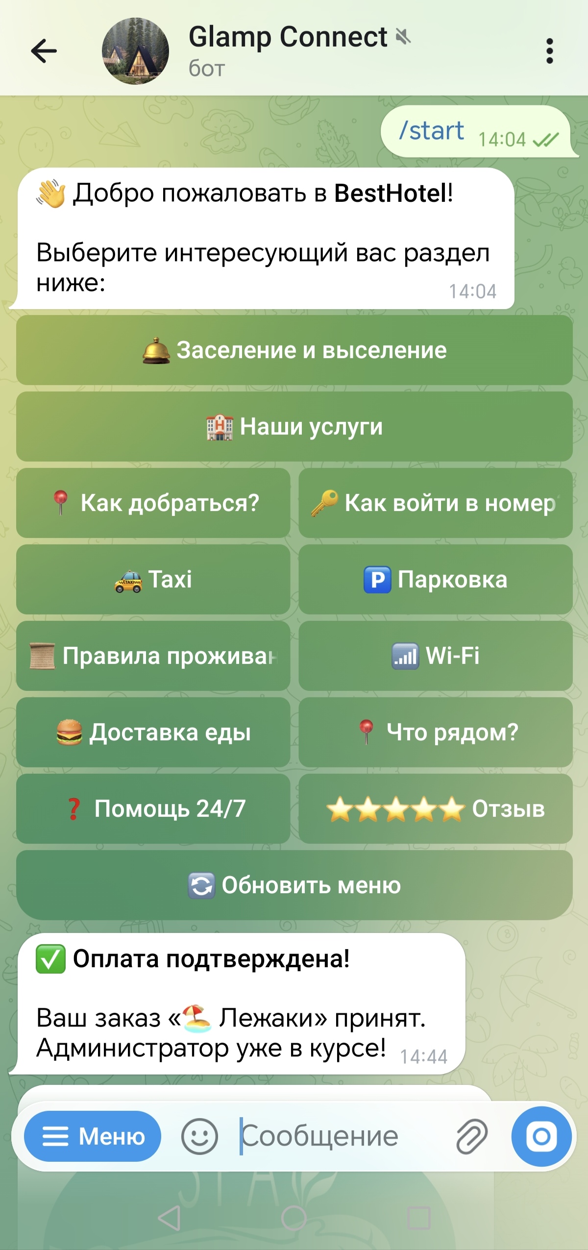 Telegram-бот отвечает гостям 24/7, принимает заказы и оплату в один клик. Автоматизируйте 70% рутины администратора.